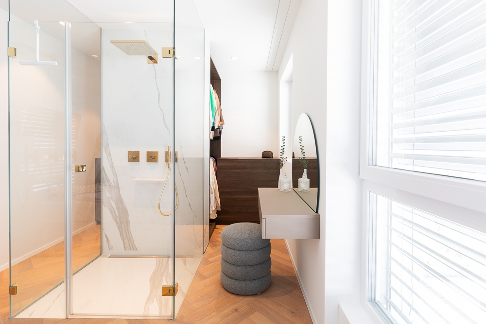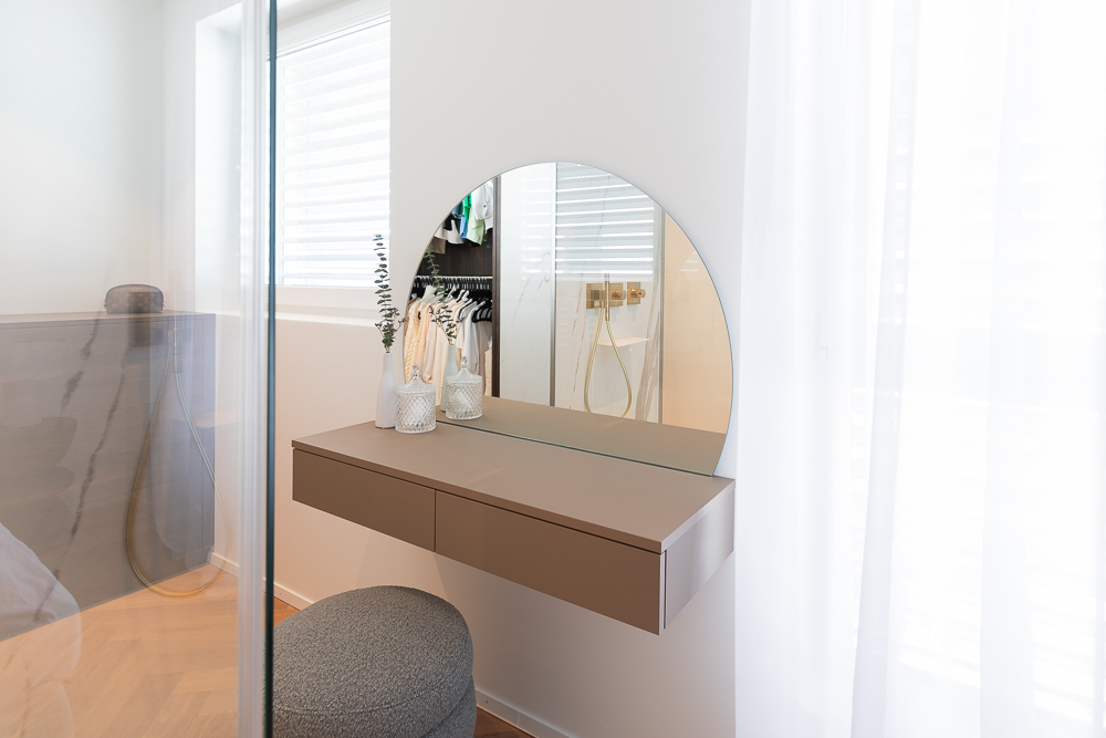Für die Dame haben wir einen schicken Schminktisch mit Spiegel platziert. So hat sie auch beim Schminken nicht nur die Dusche, sondern den ganzen Raum unter Kontrolle.